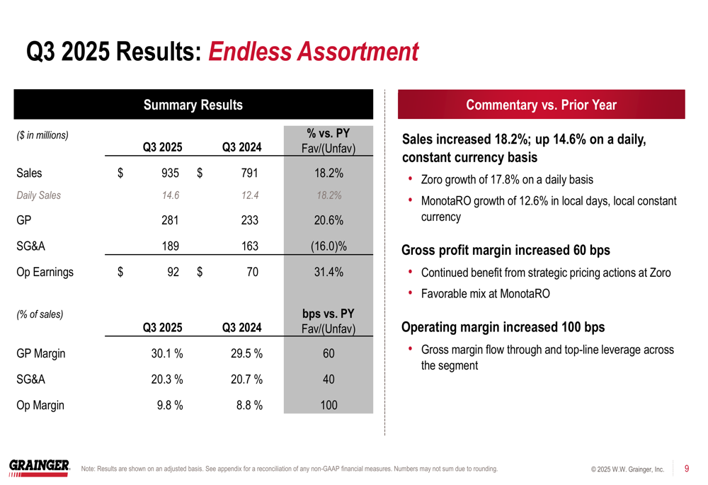 The standout performer was Grainger's Endless Assortment segment, which includes Zoro and MonotaRO. This segment saw impressive sales growth of 18.2% to $935 million, with operating earnings surging 31.4% and operating margin expanding by 100 basis points to 9.8%.