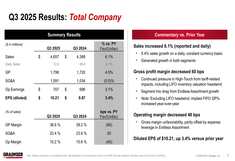 Grainger reported sales of $4.7 billion for Q3 2025, representing a 6.1% increase year-over-year, or 5.4% on a daily, constant currency basis. The company achieved an operating margin of 15.2%, up 40 basis points from the previous year, while diluted EPS grew 3.4% to $10.21.