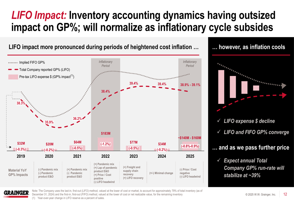 A significant factor affecting Grainger's financial performance has been the impact of tariffs and the resulting LIFO (Last-In, First-Out) accounting effects. The company has taken pricing actions over the past two quarters as tariffs went into effect and continues to engage with suppliers to manage costs.