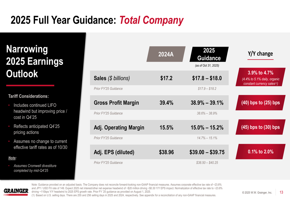 Grainger narrowed its full-year 2025 guidance, projecting sales between $17.8 billion and $18.0 billion, representing year-over-year growth of 3.9% to 4.7%. The company expects adjusted earnings per share between $39.00 and $39.75, reflecting growth of 0.1% to 2.0% compared to 2024.