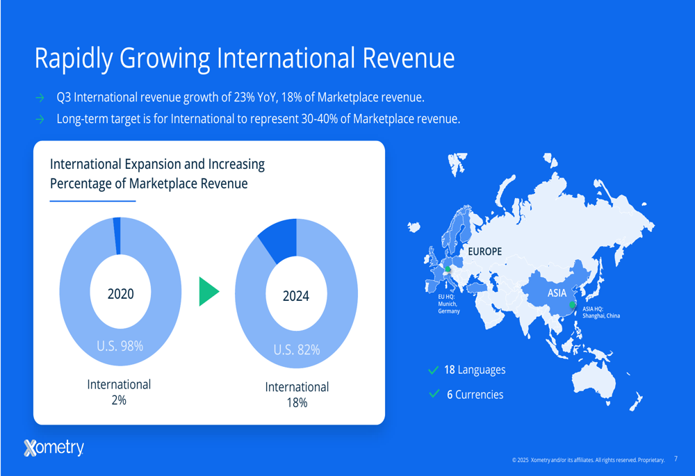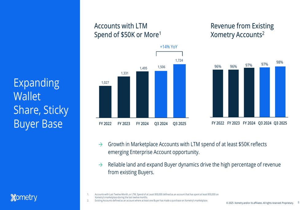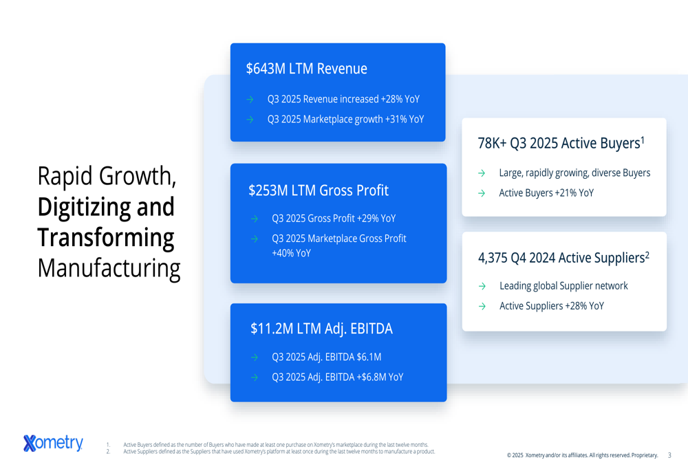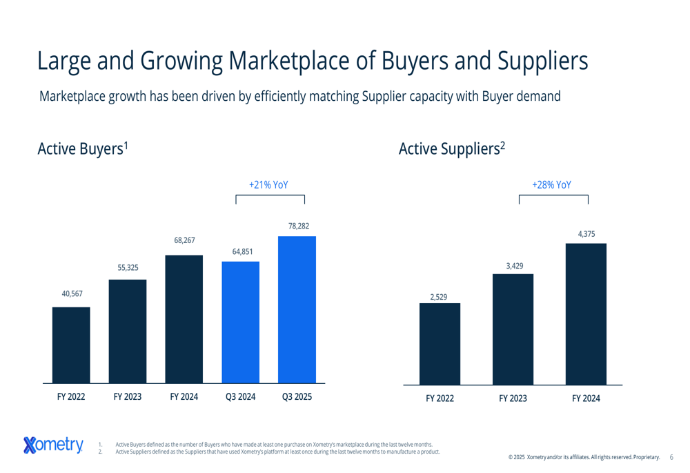 Xometry’s marketplace continues to show strong network effects, with active buyers increasing 21% year-over-year to 78,282 in Q3 2025. The company also reported 28% year-over-year growth in active suppliers to 4,375 for fiscal year 2024.