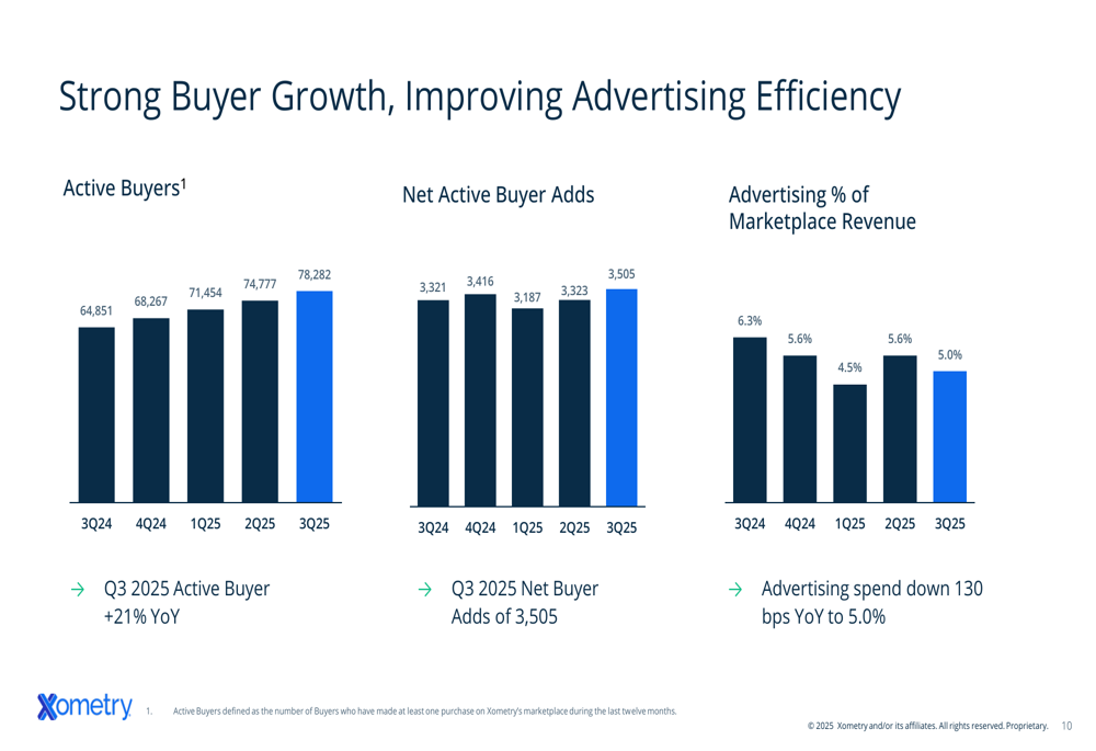 Operational efficiency continues to improve, with advertising spend as a percentage of marketplace revenue decreasing 130 basis points year-over-year to 5.0% in Q3 2025, while still adding 3,505 net new active buyers during the quarter.