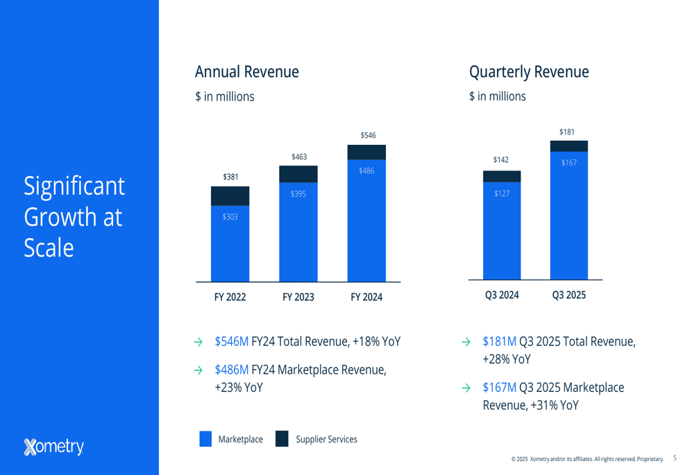 Xometry reported record Q3 2025 revenue of $181 million, representing a 28% year-over-year increase, driven primarily by 31% growth in its core marketplace business. The company also posted record gross profit of $72 million, up 29% compared to the same period last year.