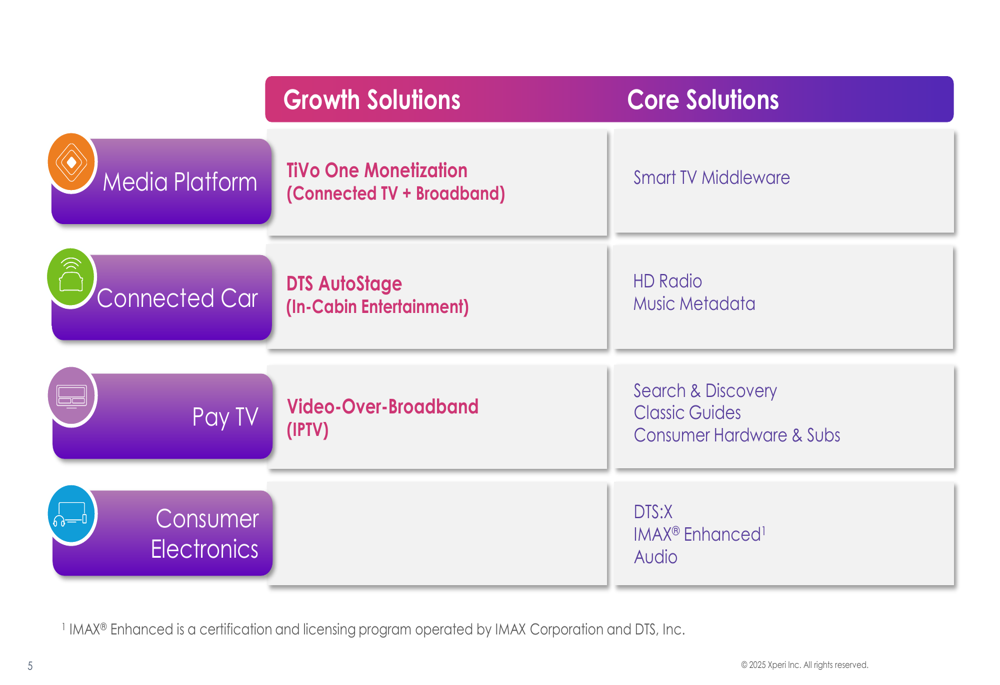 Xperi continues to execute on its strategic growth initiatives, categorizing its offerings into Growth Solutions and Core Solutions across its four key markets. The company is particularly focused on expanding its TiVo One platform, enhancing its Connected Car offerings, and growing its IPTV footprint.