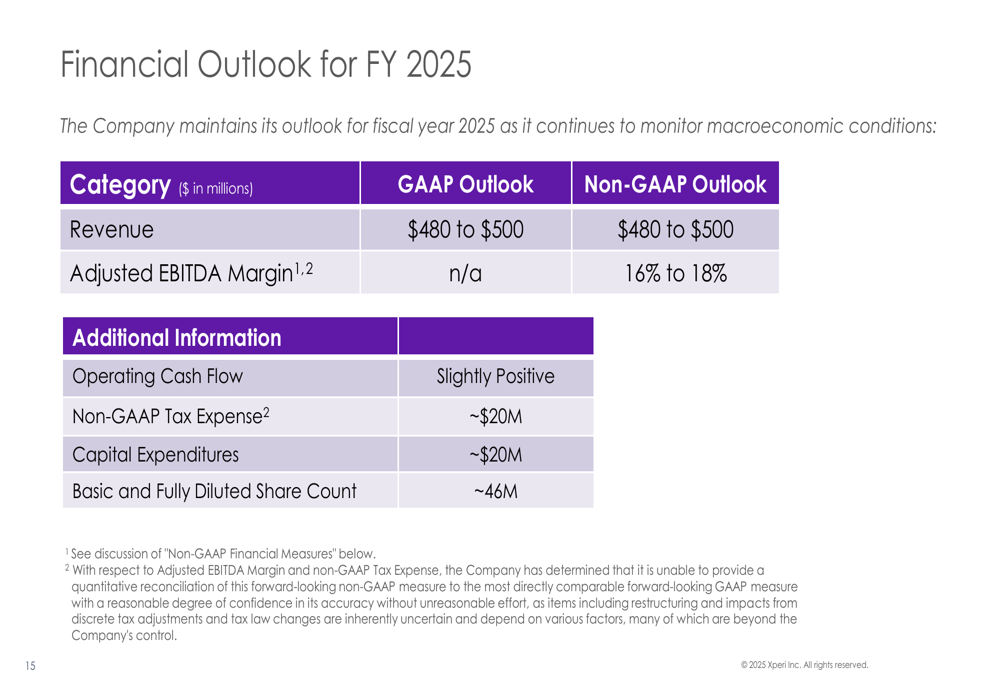 Looking ahead, Xperi maintained its full-year 2025 financial outlook, projecting revenue between $480 million and $500 million, with an Adjusted EBITDA margin of 16% to 18%. The company also expects slightly positive operating cash flow, with capital expenditures of approximately $20 million.