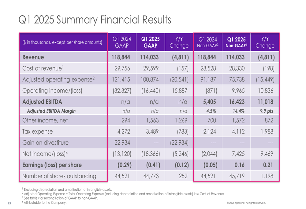 Xperi reported Q1 2025 revenue of $114 million, representing a 4% year-over-year decrease (or 2% when excluding the divested Perceive business). Despite the revenue dip, the company achieved substantial profitability improvements, with Non-GAAP Adjusted EBITDA of $16 million (14% of revenue), up more than 200% compared to Q1 2024.
