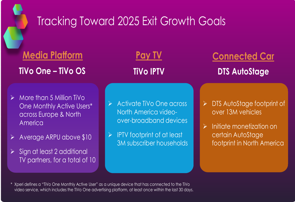The company is making progress toward its 2025 exit growth goals across multiple platforms. For the Media Platform, Xperi aims to reach more than 5 million TiVo One Monthly Active Users across Europe and North America with an average ARPU above $10. In Pay TV, the company targets an IPTV footprint of at least 3 million subscriber households. For Connected Car, Xperi plans to expand the DTS AutoStage footprint to over 13 million vehicles and initiate monetization on certain AutoStage footprint in North America.