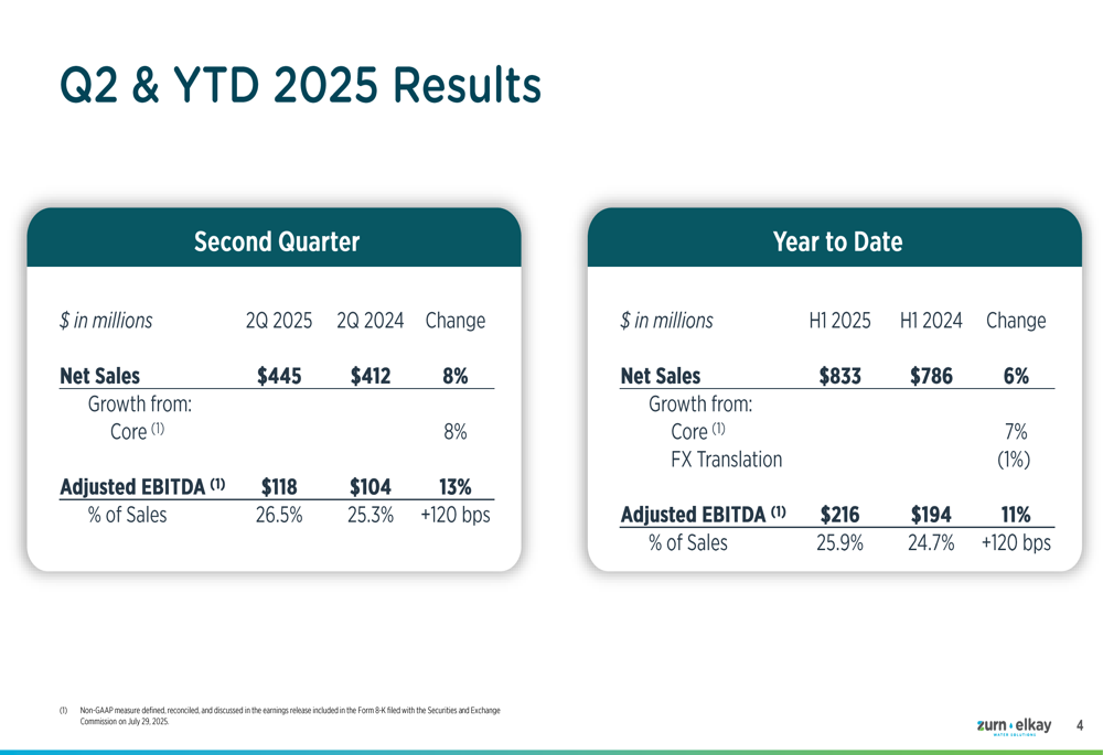 Zurn Elkay reported second quarter sales of $445 million, representing an 8% year-over-year increase driven entirely by core sales growth. The company achieved an adjusted EBITDA of $118 million with a margin of 26.5%, marking a 120 basis point improvement compared to the same period last year.