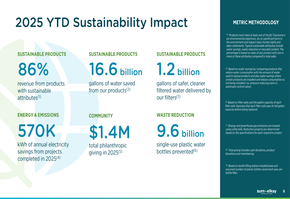 Zurn Elkay emphasized its commitment to sustainability, reporting that 86% of its revenue comes from products with sustainable attributes. The company’s products have saved 16.6 billion gallons of water and delivered 1.2 billion gallons of safer, cleaner filtered water through its filters year-to-date in 2025.